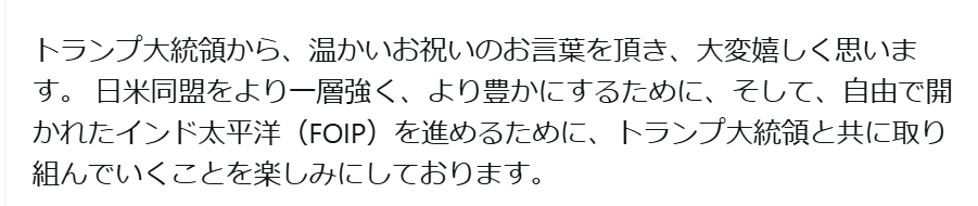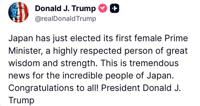 トランプ大統領日本は偉大な知恵と力強さを持ち、非常に尊敬されている初の女性首相を選出した。これは素晴らしい!日本国民にとって素晴らしいニュースだ。皆さんおめでとうございます。
